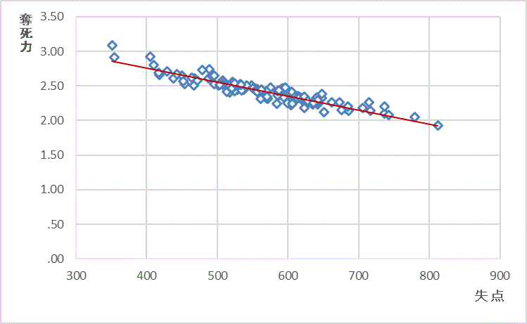奪死力 = アウト数 ÷ 被出塁数 = アウト数 ÷ (対戦打者数 − アウト数)